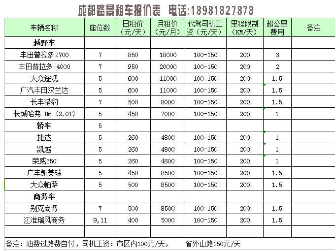 成都汽車租賃價格